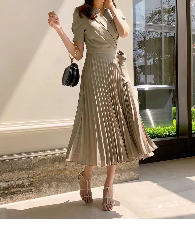 French over-knee bow strap medium and long high-waisted pleated chiffon retro dress