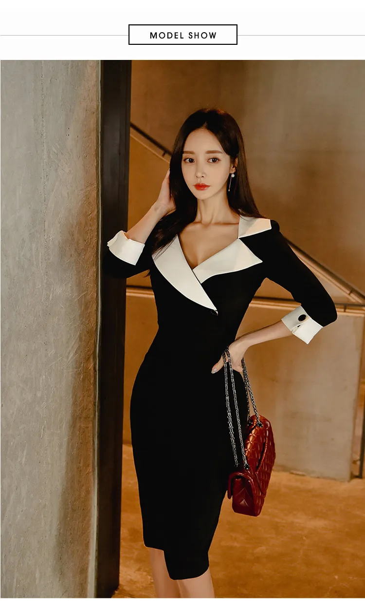 This is a dress with a unique design. It uses a suit collar design, which looks very neat. The color is black and white splicing, which is classic and fashionable. The seven-quarter sleeve design adds a bit of elegance and a certain practicality. At the same time, this dress also has a waist design, which can highlight the wearer‘s slender waist. The hip wrap style shows the curvature of women.